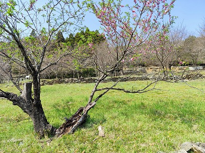 もう殆ど割れて倒れかけている桃の枝にも花が咲いている。