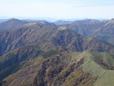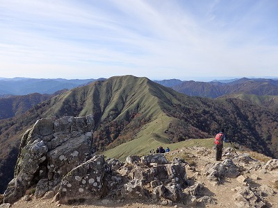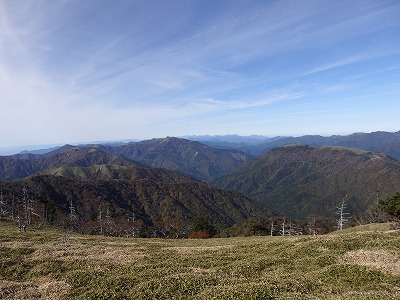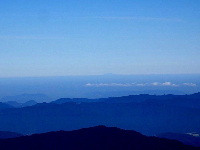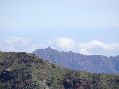 此処から見ると三嶺と天狗塚の真ん中奥に石鎚山が見えることを発見。