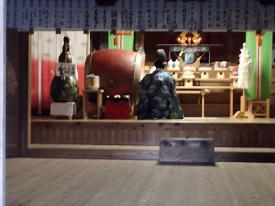 丁度、宮司さんが朝のお勤めで太鼓を叩きながら祝詞をあげられていた。