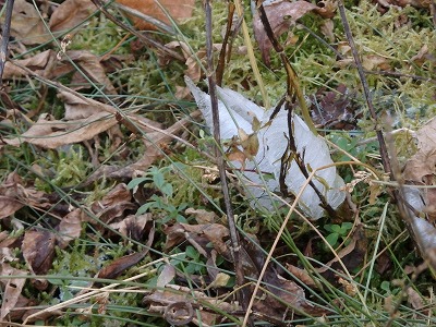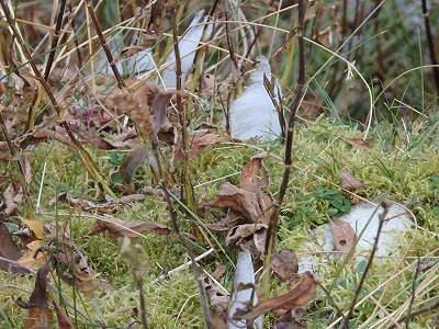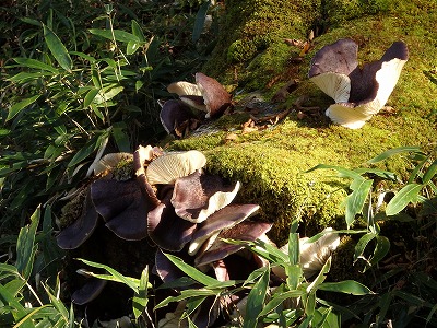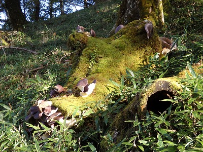 トンネルを過ぎて下ると奇妙なキノコがブナの倒木に生えていた。