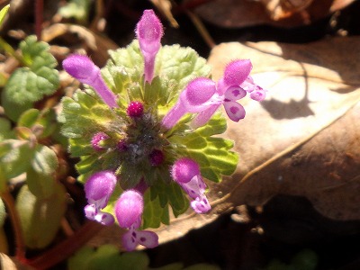 ホトケノザが朝日を浴びて精一杯花を咲かせている。