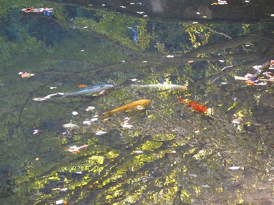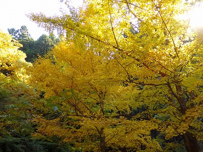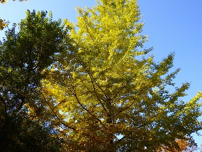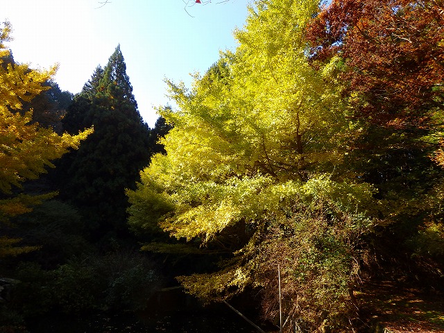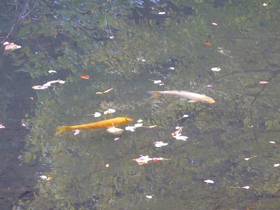 池には錦鯉が優雅に泳いでいるが、まだイチョウの葉は散っていない。