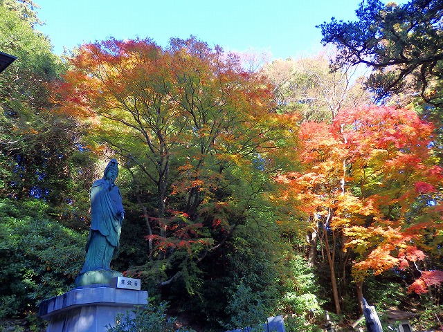 観音様のモミジはまだ緑色が多いが、それはそれで美しい。