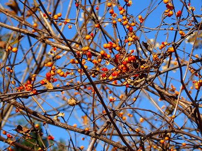ヤブコウジの実と弾け始めたツルウメモドキの実。