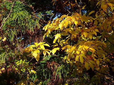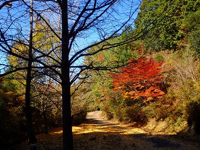 食後、車道を帰るとタカノツメが綺麗に色付いている。