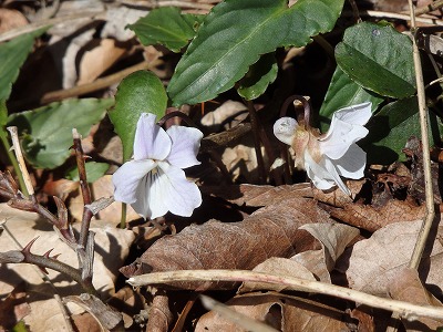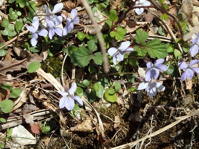 林道を帰るとタチツボスミレやニョイスミレが群生。