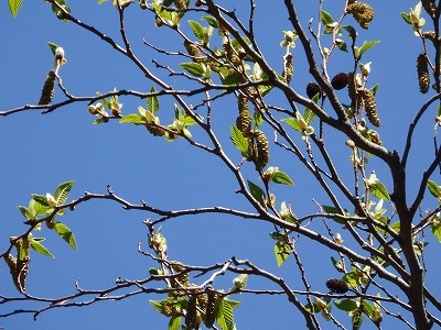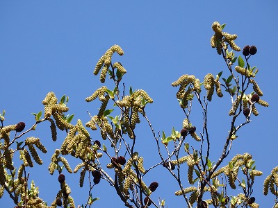 ヤマハンノキに花がぶら下がっている。