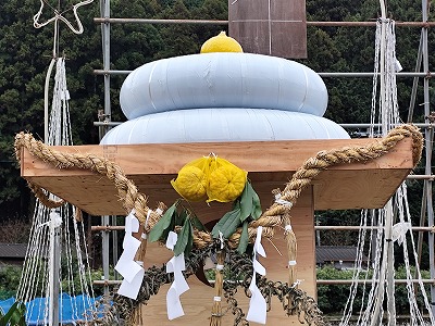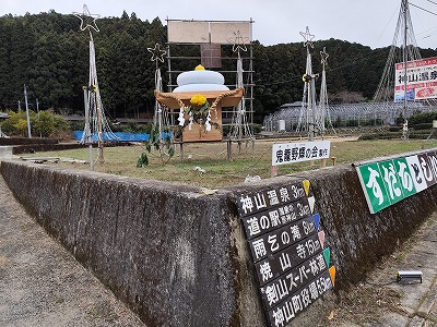 帰りの鬼籠野の三叉路交差点には巨大な鏡餅が。