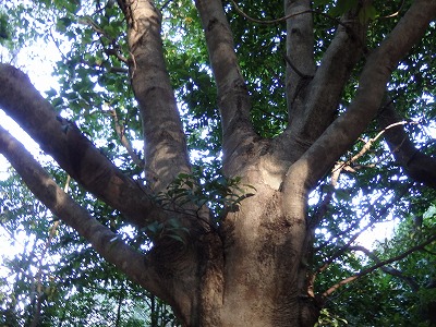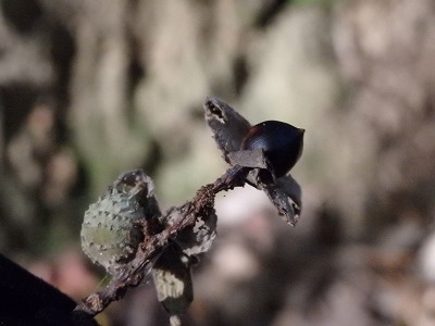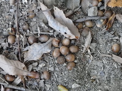 大木の下に小さくて黒い真ん丸なドングリが落ちている。