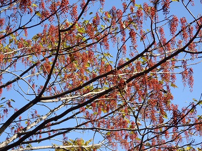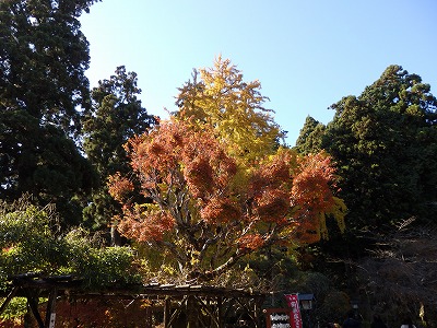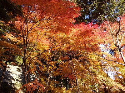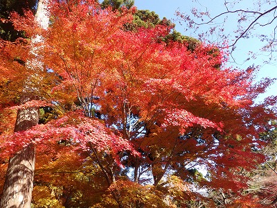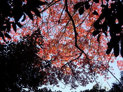 見上げると真っ赤に紅葉したヤ゙マハゼの木。