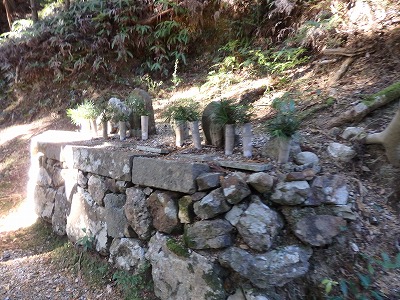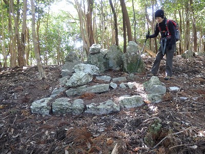 神社の遺跡のような石囲いに腰を掛けて昼食。